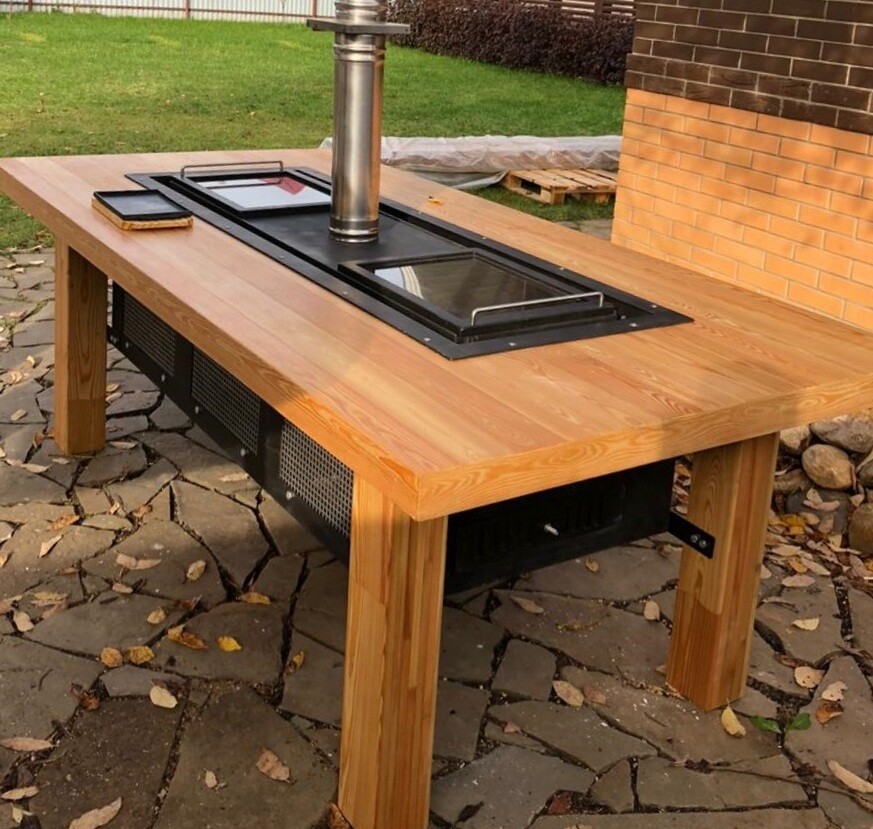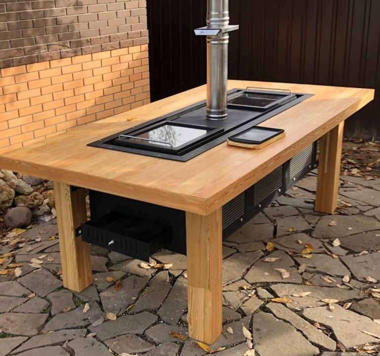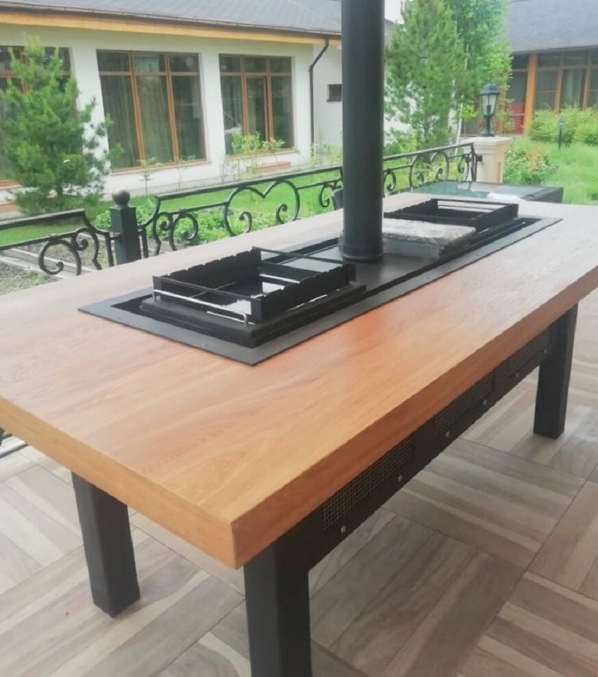 Стол с мангалом посередине может применяться и в закрытых помещениях (при устройстве должного дымохода)