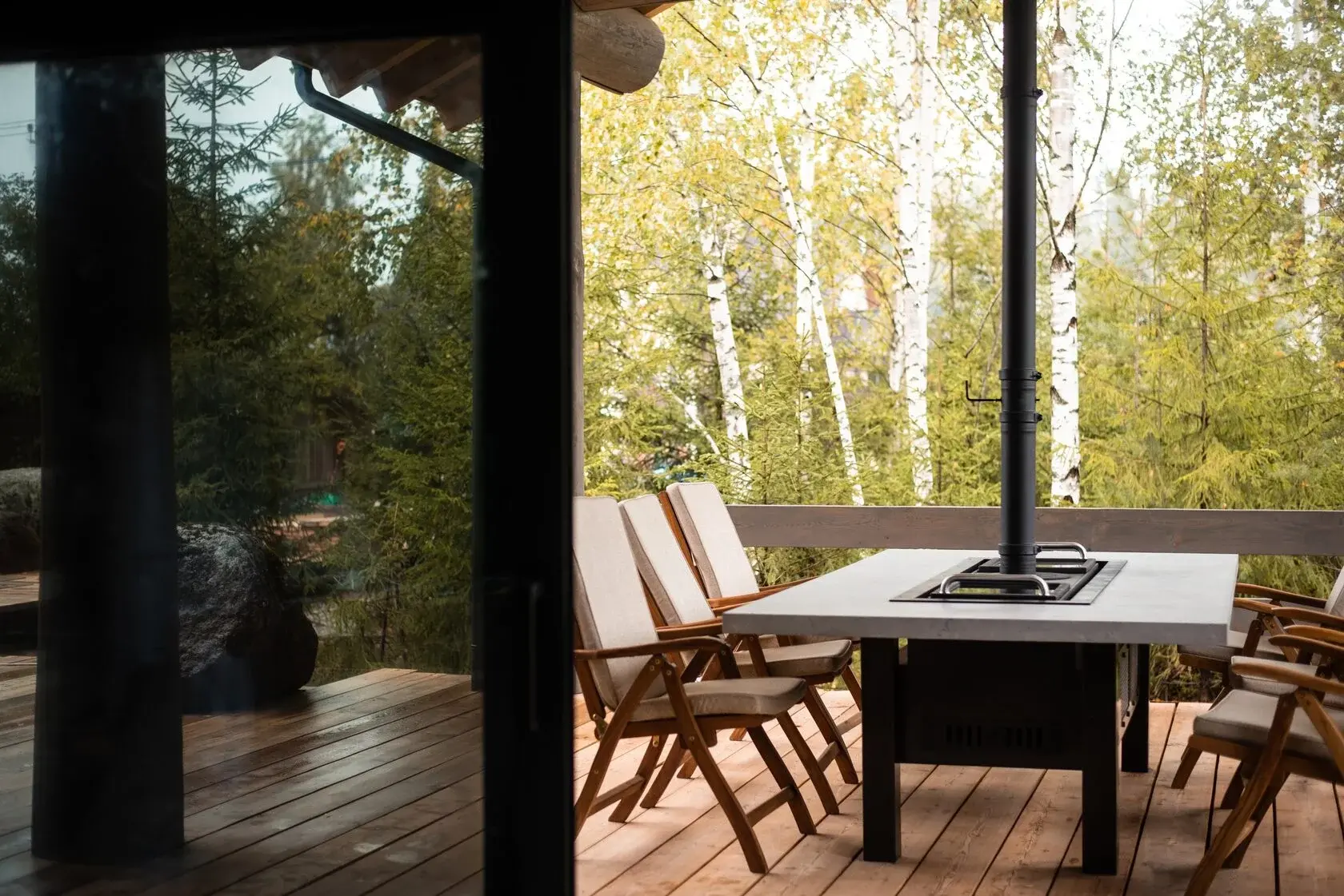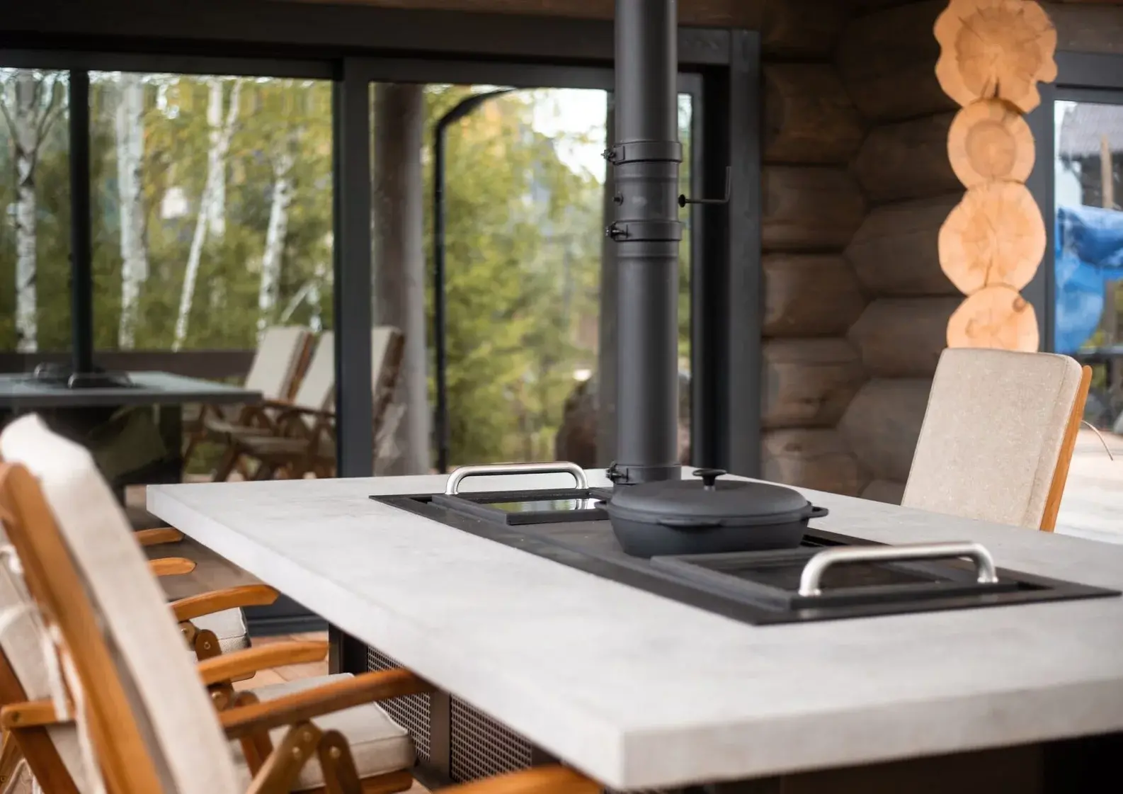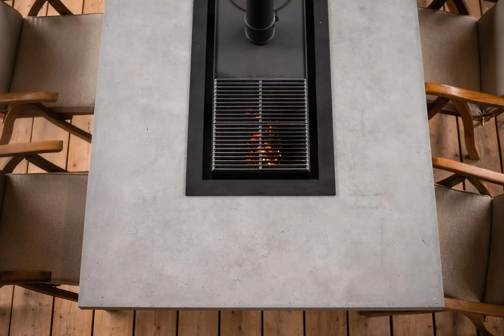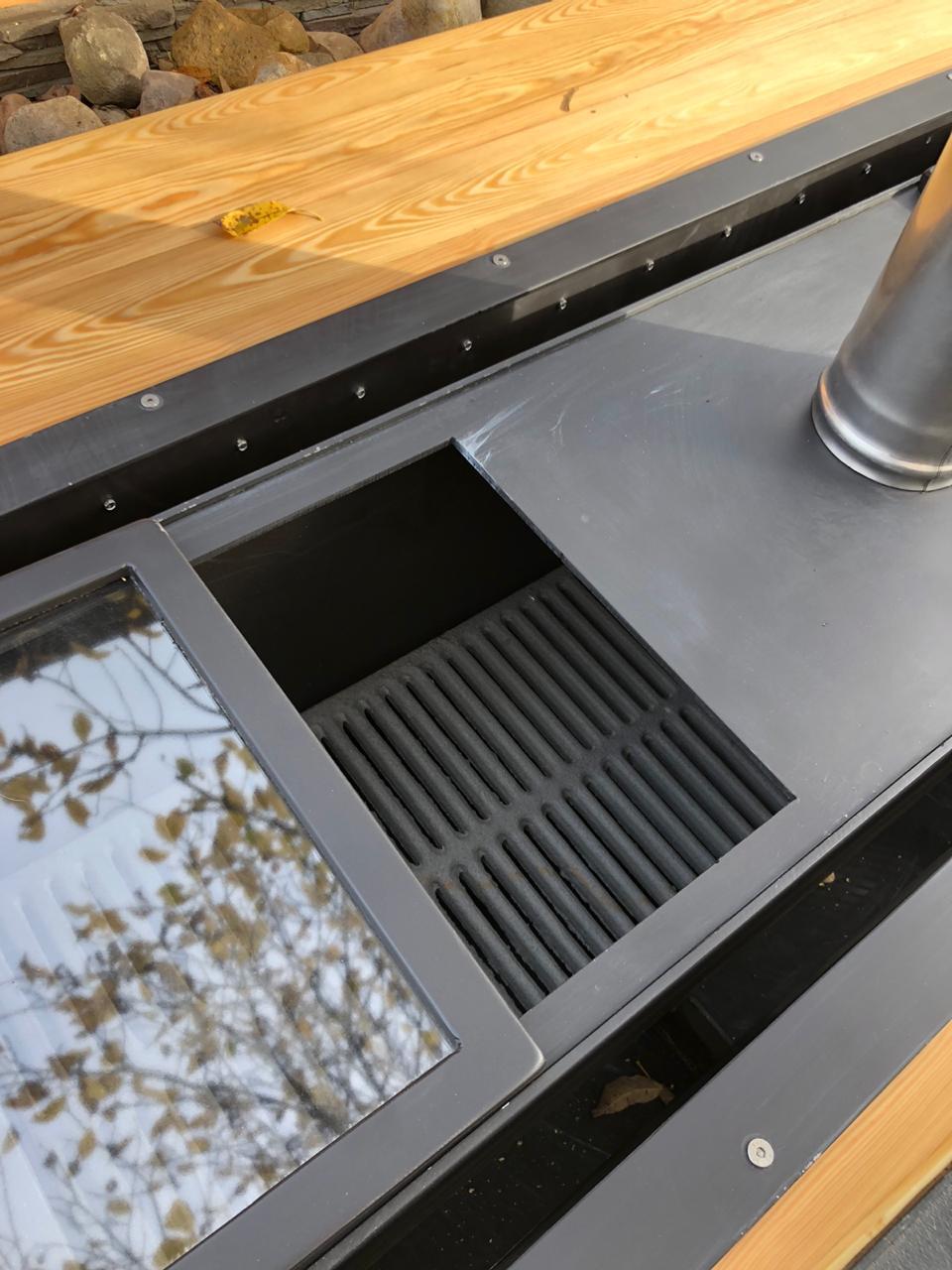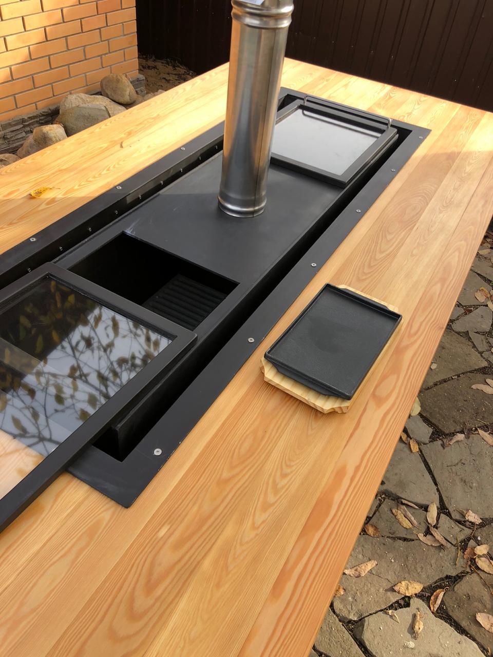 Безопасность - столешница из лиственницы снизу защищена от жара жаровни огнеупорным минеритом.